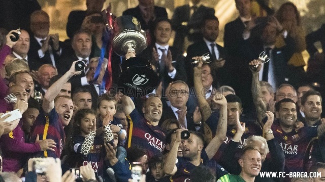 ФК Барселона одержал волнующую победу со счетом 2-0 над Севильей в финале Кубка Испании 2015/16, а сейчас пора оглянуться назад на то, что произошло после финального свистка, когда игроки и тренерский штаб праздновали не только 28-й Кубок в истории Клуба, но также и исторический дубль.